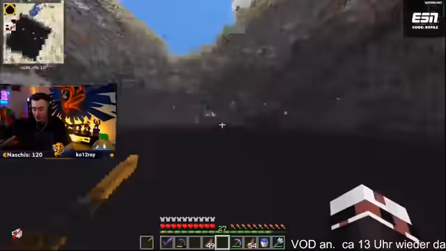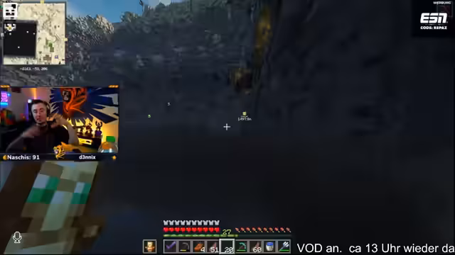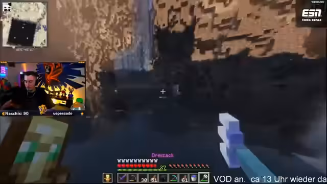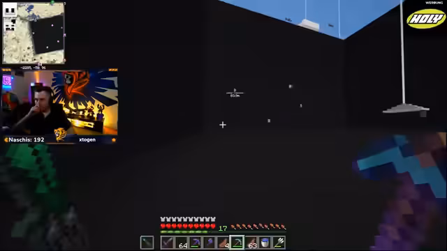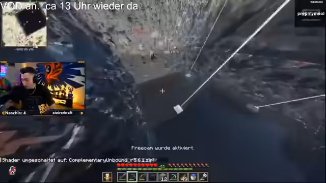 14:47:44Der Streamer zeigt sich beeindruckt von der Größe und Optik des fertigen Lochs, das wie ein Meer aussieht. Er fordert die anderen Teilnehmer auf, mit der schwarzen Wolle sofort mit dem Bau der nördlichen Mauer zu beginnen. Währenddessen werden erste organisatorische Fragen geklärt, wie der Zugang zum Lager über Leitern oder Wasserfälle und die Verteilung von Ausrüstung wie Behutsamkeitspickaxe und Enderchest.