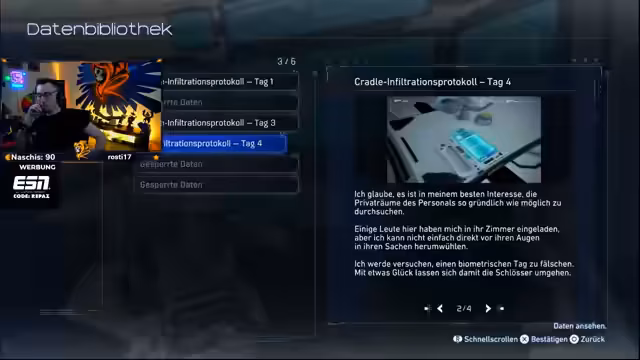 04:27:01Der Streamer beginnt mit einem Spiel namens Pragmata auf der PS5. Er wählt zunächst das Spiel mit einem Riot Blaster und Sternschnuppen-Netzwerk aus. Nach einiger Zeit wechselt er jedoch wieder zur Pistole, da er diese als geiler empfindet. Beim Erkunden der Spielwelt stößt er auf ein Gerücht, dass das Sicherheitsteam alle Geräte und Zugriffsprotokolle überprüfen wird. Er beschließt, das heimlich installierte Spiel zu löschen.