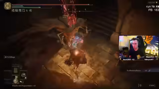 02:18:31Repaz äußert sich erleichtert darüber, Margets Scheckel zu haben und vermutet, dass Morgoth noch lebt. Er sucht nach einem Luftstrom und einer verehrten Geist Asche. Er gibt Spenny einen Tipp bezüglich Werbung und fragt, ob das Mario Kart Turnier an einem Tag stattfindet. Repaz landet auf einer Burg, um die Gnade zu aktivieren und nach Items zu suchen, obwohl es dort sehr dunkel ist. Er trinkt einen Trank, um sicher zu sein, und sucht nach nützlichen Arzneimischungen. Repaz umgeht erfolgreich eine Burg, um mehr Items einzusammeln und Skeletry Fragment Level zu pushen. Er wundert sich, warum die Gegner in einem Bossraum nicht feindlich gesinnt sind und hätte erwartet, dass sie sich gegenseitig bekämpfen. Repaz stellt fest, dass er hätte rasten sollen und sammelt gute Stücke ein, bevor er einen Boss macht. Er ist seit 22-23 Stunden im Run und war schnell unterwegs. Er fragt sich, ob ein Invade kommt und warum er den Gold Scarabius noch drin hat.
