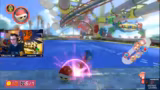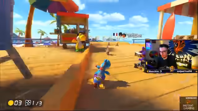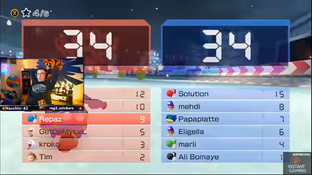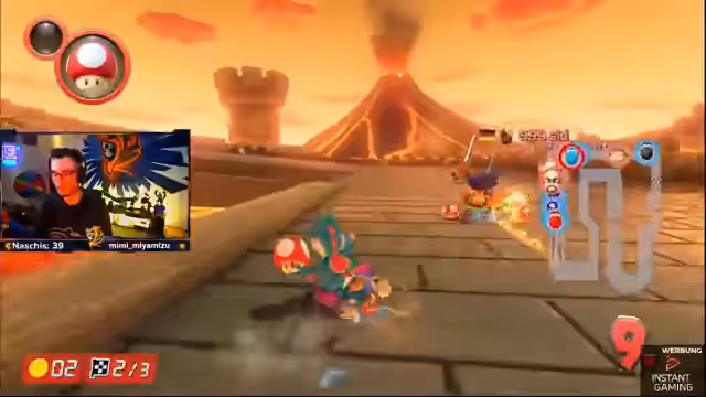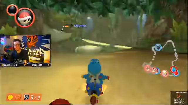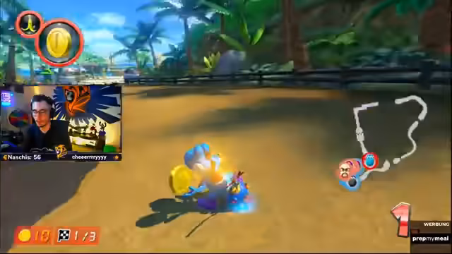 03:02:04Der Streamer ist auf Position sechs und hat einen Blauen. Er bittet das Team, sofort Items zu feuern. Der Streamer verspricht vorne zu kommen und braucht Unterstützung. Er fährt hinter Kroko und muss sich verteidigen. Die Nerven liegen blank und das Fokusieren der Gegner ist wichtig.