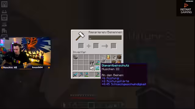 01:52:06Es kommt zu einer humorvollen Diskussion über eine Hose mit der Verzauberung „Huschen 3“, die als das „beste Item in ganz Minecraft“ bezeichnet wird. Ein Spieler, Willi, soll die Hose bekommen, um deren Wert zu erkennen. Es wird spekuliert, ob die Hose 200 Euro wert ist oder ob eine Sub-Bomb als Gegenleistung angemessen wäre. Die Beschaffung von Huschen 3 erfordert einen weiten Weg zu einer Ancient City, was als „negativ“ abgelehnt wird. Die Hose von Willi ist beschädigt und muss repariert werden, wobei Feuerschutz als nützliche, aber nicht unbedingt entscheidende Verzauberung angesehen wird. Die Reparatur und Verbesserung der Hose wird als nicht tragisch betrachtet, da Willi nicht oft in Kämpfe verwickelt ist. Die Kosten für die Reparatur und Verzauberung sind jedoch hoch.