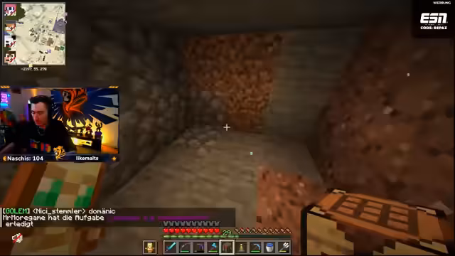 02:15:20Die Baumfarm wird vorerst nicht weiter ausgebaut, stattdessen soll mit einer Honigfarm begonnen werden. Der Schacht bleibt eine wichtige Aufgabe, und es wird über die Ursachen von schwebenden Blöcken im Schacht spekuliert. Die Basis wird als „übergeil“ empfunden, obwohl der Wunsch besteht, den Berg in der Nähe zu entfernen. Es gibt weitere Beschwerden über Norex, der einfach abgehauen ist. Niki streamt aus dem LARPARTY-Studio und plant, in ein benachbartes Zimmer umzuziehen, das früher sein Streaming-Studio war. Es wird über die Beschaffung neuer PCs gesprochen, da die alten kaputt sind. Die Spieler kehren zur Basis zurück, um Schwämme zu liefern, und es wird über einen Deal für eine Hose mit Huschen 3 gesprochen. Ein Spieler namens Fabo hat einen Maze (ein spezielles Item) durch einen „First Try“ in einer Ancient City erhalten, was als „krank“ bezeichnet wird. Es wird auch über die Regeln des Servers bezüglich Diebstahl und das Bann-System diskutiert.