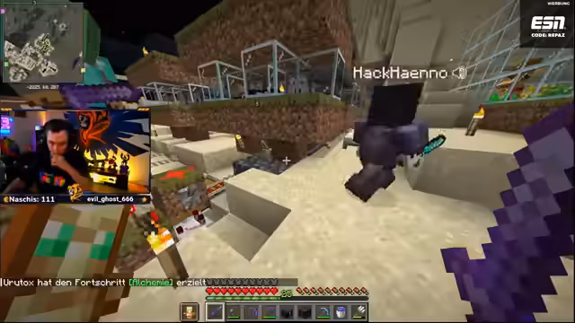 04:44:44Der Hauptstreamer arbeitet an der Holzfarm und benötigt Seelensand, der jedoch von Kroko weggeworfen wurde. Ein Teammitglied bietet an, Seelensand aus einer Ancient City zu holen, was eineinhalb Stunden dauern würde. Es wird jedoch entschieden, dass der Nether-Besuch erst ab 20 Uhr erlaubt ist. Der Hauptstreamer erinnert sich an die Aufgabe, Federfall-Schuhe für Hand of Blood zu besorgen, und verzaubert diese für ihn. Es wird betont, wie wichtig es ist, dass die Schuhe nicht kaputt gehen. Die Suche nach TNT-Blöcken für die Farm führt zu Kroko, der für die Beschaffung von Schwarzpulver zuständig ist. Die Teammitglieder tauschen sich über ihre Tode im Spiel aus, wobei der Hauptstreamer zwei Tode hat, einen off-stream und einen in Sids Tintenfischfarm. Die Holzfarm nimmt Gestalt an, aber es fehlen noch Teppiche und Gitter. Ein Teammitglied bietet an, seine XP-Farm nach Fertigstellung zur Verfügung zu stellen. Die Gefahr von ungesicherten Baugruben wird deutlich, als ein Spieler in ein tiefes Loch fällt und fast stirbt.