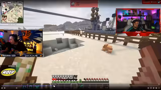 01:57:37Die Spieler vergleichen ihre Fortschritte mit anderen Teams. Ihr eigenes Loch ist mit 200x300 Blöcken 50% größer als das eines anderen Teams, das 200x200 Blöcke misst. Das andere Team legt jedoch mehr Wert auf Struktur und Säulenbau, während das eigene Projekt auf schiere Größe abzielt. Die Teams sind Nachbarn, was auf der Karte deutlich wird. Es gibt Beschwerden über einen Spieler namens Norex, der seinen Auftrag, einen Berg abzubauen, nicht erfüllt. Die Teammitglieder diskutieren über Deals und die Einhaltung von Absprachen. Ein Spieler namens Fabo wird gefragt, ob er Randall kennt, was eine humorvolle Anspielung auf das Petzen ist, da Fabo sich über Norex beschwert. Es wird auch über die Beschaffung von Glas und die Suche nach Schwämmen gesprochen, um die Trockenlegung zu beschleunigen. Ein Spieler namens Reeps wird für seine Hilfsbereitschaft gelobt, da er sich um die Ausrüstung des Teams kümmert und Schwämme zur Verfügung stellt.