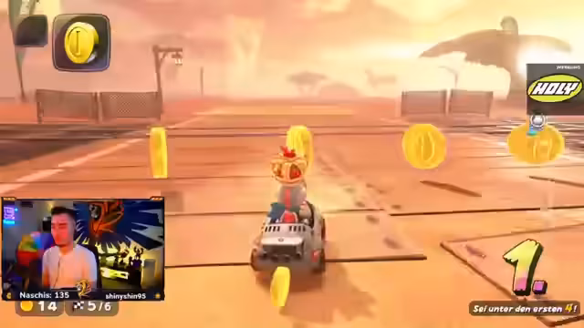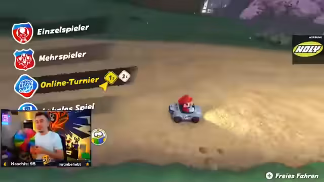00:33:23Nach einer kurzen Unterbrechung wegen des Scam-Rads wird eine Werbepartnerschaft mit "Holy Energy" beworben. Der Streamer empfiehlt einen Geschmack des proteinhaltigen Eistees und nennt einen exklusiven Gutscheincode. Kurz darauf wechselt der Streamer zur "Mario Kart"-Version "Mayo Kart World", um seine Ziel verfolgen, sammelt aber zunächst nur wenige Münzen und beklagt den geringen Spielkomfort im Vergleich zur Solo-Karte.