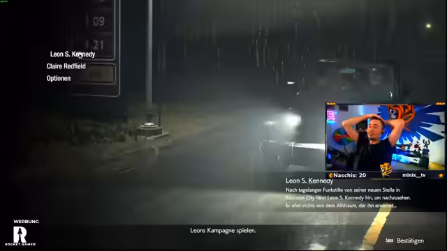 00:22:54Leon Kennedy trifft auf die chaotische Situation in Raccoon City und begegnet Marvin, der ihm das legendäre Messer übergibt. Nachdem der Officer verletzt wird, macht sich Leon auf den Weg zur Polizeistation. Das Inventarmanagement erweist sich als knifflig, da Platz sehr begrenzt ist. Der Streamer stößt auf ein erstes Rätsel, bei dem er die Initialien der Kollegen auf Schreibtischen knacken muss. Er sammelt Gegenstände wie Schwarzpulver und Notizen, kombiniert erweiterte Magazine und lernt das Prinzip des Wegrufens nicht mehr benötigter Objekte.