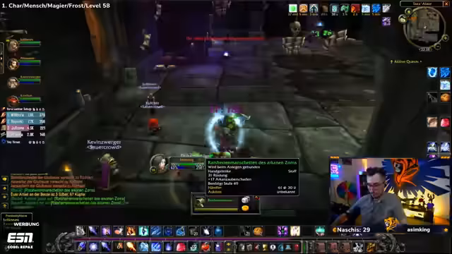 08:39:41Der Stream konzentriert sich auf das Bewältigen von Mobs in einem Dungeon. Der Streamer und seine Gruppe kämpfen gegen verschiedene Gegner, darunter kleine Käfer und Ghoule, wobei es zu Problemen mit der Aggro-Kontrolle kommt. Der Streamer wechselt zwischen Heilung und Schadenszaubern, während die Gruppe versucht, Quest-gegenstände zu finden und zu looten. Es kommt zu Diskussionen über den richtigen Zeitpunkt zum Pullen und zur Verteidigung von Schlüsselpersonen in der Gruppe, insbesondere wenn diese starken Schaden erleiden.