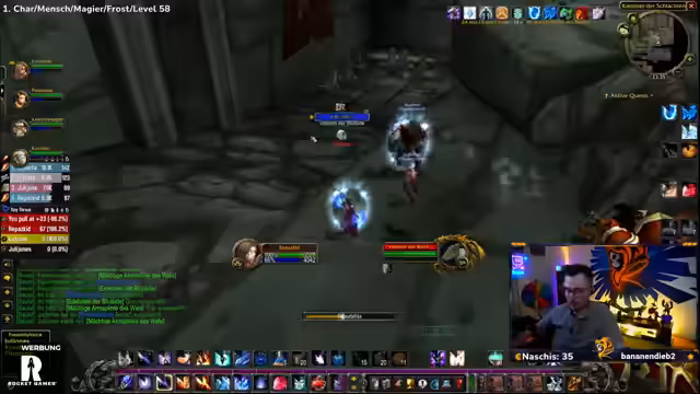 01:09:58Der Streamer erklärt die Funktion von Weak Auras zur frühzeitigen Erkennung von Kakerlaken, die andere Gruppen adden können. Kurz darauf kommt es zu einem kritischen Zwischenfall, bei dem ein Charakter namens Chef in BRD stirbt, weil sein Vanish durch einen DoT abgebrochen wurde. Der Streamer ist verärgert, da der Spieler ungeduldig alleine in den Dungeon gegangen war und die Gruppe sowieso noch geplant war.
