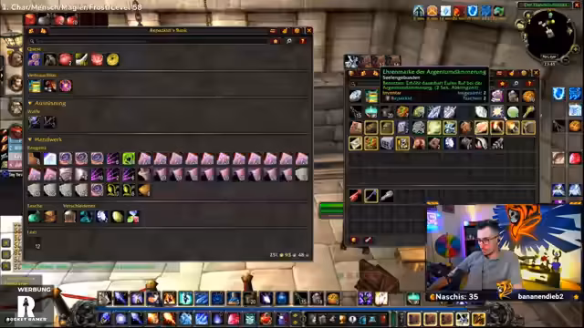 07:40:30Es finden Diskussionen über den nächsten Dungeon statt, wobei Optionen wie Scholomance und Stratholm in Betracht gezogen werden. Der Streamer倾向于Stratholm, da er den Schlüssel dafür besitzt. Die Gruppe koordiniert ihre Aktionen, indem sie sich nach Ironforge portieren lassen, um Quests abzugeben und sich für den Dungeon vorzubereiten. Es werden Items verkauft oder weggeworfen, um Inventarplatz zu schaffen, und es gibt Pläne, sich in Stratholm einzuloggen und die Gruppe zu sammeln.