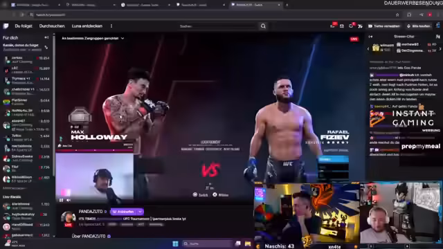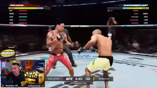 03:41:57Der Stream beginnt mit technischen Vorbereitungen für das UFC-Turnier. Der Streamer zieht kurz Matze und Basti runter, um die Audio-Zugänglichkeit und die rechts platzierten Audio-Untertitel zu überprüfen. Er gibt einen kurzen Überblick über die geplanten Kämpfe und erwähnt, dass Max Holloway gegen Dustin Gaethje der Hauptkampf des Abends sein wird. Auch werden Pläne für zukünftige Turniere angesprochen, bei denen multiple Gewichtsklassen integriert werden sollen, um die Vielfalt der Kämpfe zu erhöhen.