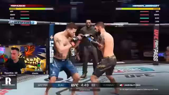 04:37:26Das Turnier nähert sich dem Ende und der Kampf zwischen Willi und Roat steht an. Beide Kämpfer wählen ihre Fighter, Willi den erfahreneren Islam Makhachev und Roat den aufstrebenden Justin Gaethje. Der Streamer analysiert die Stärken und Schwächen der Charaktere und gibt an, dass Makhachev zwar ein Wrestler ist, der in einem reinen Stand-and-Bang-Kampf jedoch eine Übermacht darstellen könnte. Der Kampf beginnt und wird als besonders wichtig für den Turnierausgang bewertet, da der Sieger ins Finale einzieht.