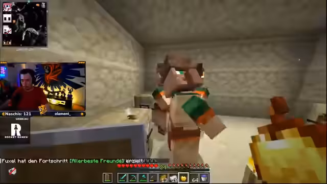 04:48:40Zu Beginn des Stream-Ausschnitts geht es um die Planung einer Villagerfarm. Der Streamer möchte zwei Villager aus einem Dorf holen, um diese in einer eigens gebauten Farm zu vermehren und für den Handel mit Rohstoffen wie Smaragde oder Eisen zu nutzen. Um dieses Ziel zu erreichen, werden klare Aufgaben verteilt: Henno wird beauftragt, alle Betten im Dorf abzubauen und einen Villager in ein Boot zu lotsen, um ihn zur Hauptbasis zu bringen.