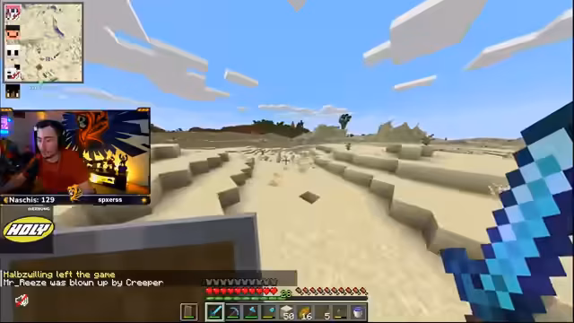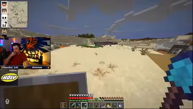 00:37:29Der Start in der Wüste stellt sich als überaus schwierig heraus, da das Biom keine Nahrung oder Tiere bietet. Dies wird im Kontext des aktivierten Hungers als Albtraum empfunden. Der Streamer macht sich auf, um Essen zu finden, stößt aber nur auf Hasen, die keinen Nahrungsertrag liefern. Unterwasser bietet sich als relativ sicherer Bereich an, um Ressourcen wie Eisen zu farmen, ohne Schaden zu nehmen.