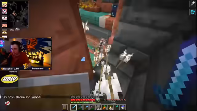 05:25:36Eine Schlüsselmoment ist ein erfolgreiches Aktion, das als 'Scam' bezeichnet wird. Willi und ein anderer Streamer geben vor, weniger kompetent zu sein ('minderbemittelt'), um einen anderen Spieler dazu zu bringen, ihnen vier Diamantblöcke zu schenken. Dieser Erfolg wird jedoch von einem tragischen Ereignis überschattet, als ein Streamer stirbt, was den symbolischen Tod einer der sieben Säulen markiert.