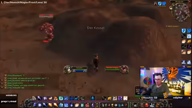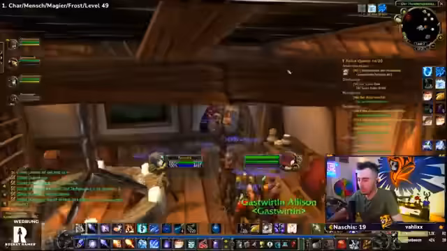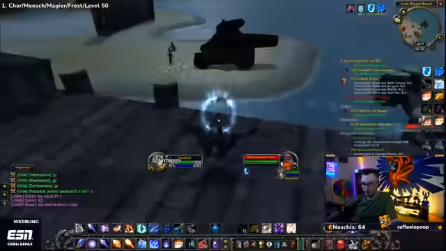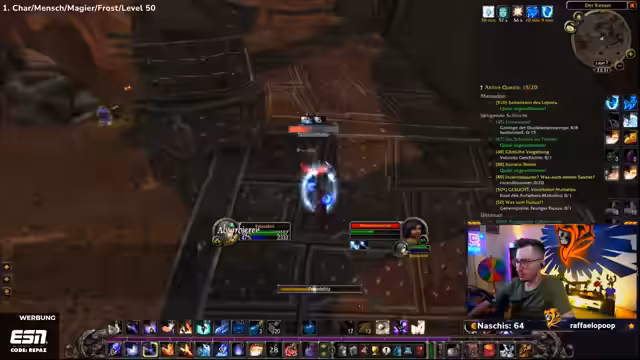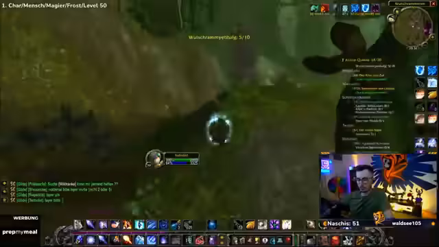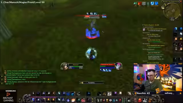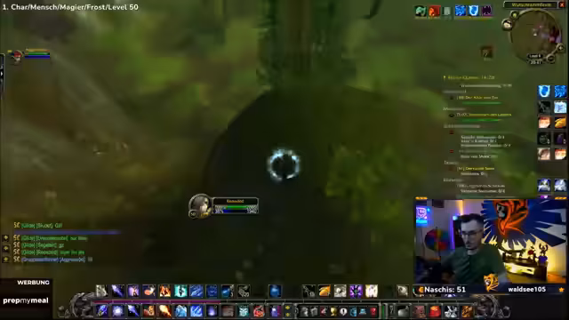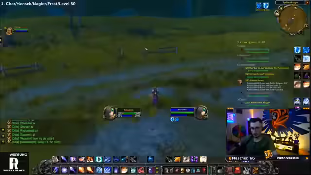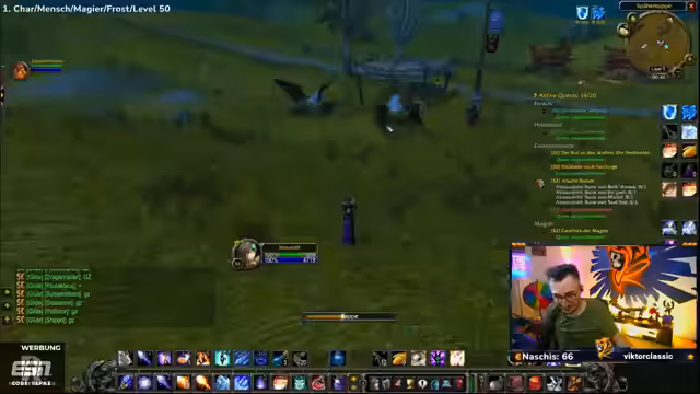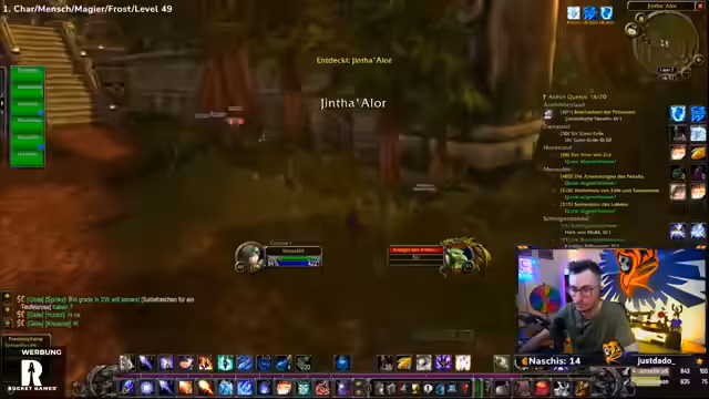 04:30:16Der Spieler erreicht Level 50 und nutzt dies, um neue Zaubersprüche zu erlernen, darunter Wasser herbeizaubern, Kältekegel und Frostblitz. Es folgt eine Diskussion über die angepassten Buff-Zeiten (jetzt 19:08 und 19:13), wodurch sich die Strategie für die weiteren Quests ändert. Vorbereitungen für die nächsten Ziele werden getroffen, einschließlich des Sammelns von Materialien wie Magiestoff- und Seidenstoff-Ballen.