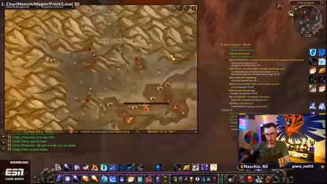 04:46:23Nach dem Erreichen von Level 50 entsteht eine Diskussion über die optimale Quest-Auswahl. Der Spieler erwägt, in Gebieten wie Un'Goro, Desolace oder Teufelswald zu questen, ist jedoch unsicher wegen der Gefährlichkeit der Gegner. Die Gruppe sucht nach sicheren AOE-Farming-Spots und plant, bestimmte Quests abzugeben, während sie die Vorteile von Buffs und Ausrüstung upgraden.