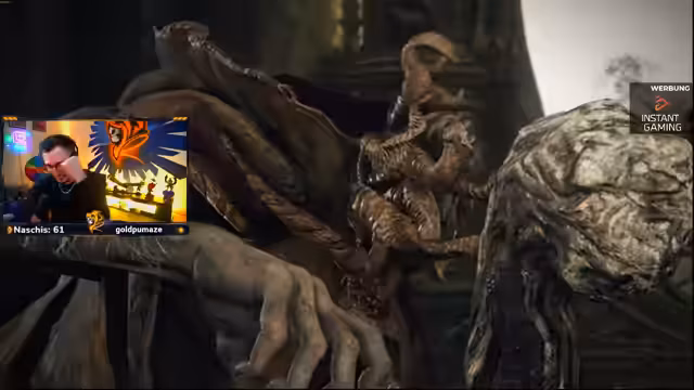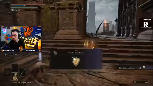 02:38:48Ein riskanter Sprung, an dem schon andere gescheitert sind, wird gemeistert. Der Streamer bereitet sich auf einen Bosskampf vor und packt den Goldscarabios für mehr Ruhe ein. Er analysiert seine Waffe, die Blutflammklinge, und erkennt deren Stärken und Schwächen. Besonders hebt er hervor, dass es sich um eine seltene Dunkelschmiedewaffe handelt, die Affinitäten erlaubt und somit ein absoluter Ausnahmefall ist.