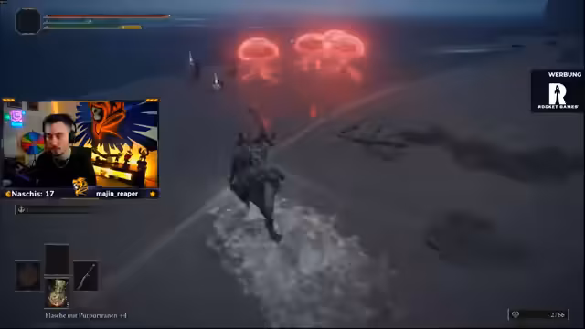 02:06:23Der Streamer gerät in mehrere knappe Todesfälle und betont die Wichtigkeit von Godfraiths großer Rune, die ihm das Leben gerettet hat. Er zeigt sich eingerostet und nicht mehr ganz fit im Spiel, was Fehler begünstigt. Gleichzeitig plant er, seine Ressourcen, wie Renala für Mana, zu verbessern, und ist optimistisch, reich werden zu können.