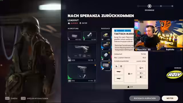 04:48:49Der Spieler kämpft mit Platzproblemen in seinem Lager, was ihn dazu zwingt, graue und niedrigstufige Waffen zu entsorgen. Er benötigt mehr Gewichtskapazität und überlegt, ins Fitnessstudio zu gehen, um sich im echten Leben zu 'fetzen' und mehr tragen zu können. Dies würde jedoch seinen geplanten Nachtstream erschweren, da er nach dem Training duschen und essen muss, was ihn 'platt' macht. Er kann nicht direkt nach dem Essen ins Fitnessstudio gehen, da er sonst 'massivst Seitenstechen' bekommt, was ihn frustriert. Er fragt sich, ob er seine Gegenstände lieber recyceln oder verkaufen soll, um Platz zu schaffen und Ressourcen zu gewinnen. Ein neuer Trailer für 'Bio 7 und Zombies' wird erwähnt, was auf andere Interessen außerhalb des aktuellen Spiels hindeutet.