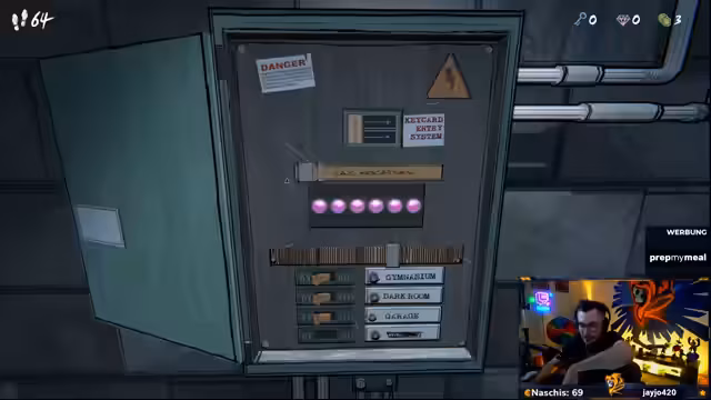 04:30:05Ein 'Electronic Keycard Entry System' stellt ein Hindernis dar, da der Strom für die Sicherheitstür fehlt. Der Streamer erkennt, dass ein 'Utility Room' mit 'Fusebox' benötigt wird, um die Tür zu aktivieren. Er findet 'Car Keys' und eine 'Keycard', doch der Zugang zur Garage scheitert. Mit viel Mühe und dem Einsatz eines gefundenen 'Lockpick' gelingt der Durchbruch in den 'Passageway', was ihm zehn Schritte einbringt und den Fortschritt sichert. Der 'Softlock' der vorherigen Runde ist damit überwunden.