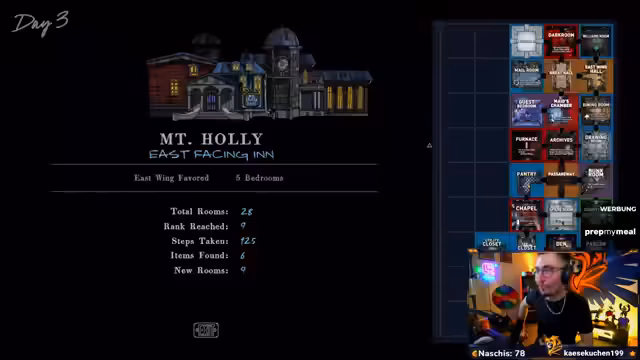 04:11:21Im 'Drawing Room' wird eine zentrale Mechanik erklärt: Jeder Klick auf eine Tür generiert drei mögliche Grundrisse, von denen einer ausgewählt werden muss. Items oder Räume können ein kostenloses 'Redraw' erlauben. Ein fortgeschrittenes Rätsel in der 'Chapel' stellt den Streamer vor eine mathematische Herausforderung. Es geht um das Finden einer Kombination, die am Ende auf 30 führt. Dafür werden Dart-Prinzipien (Double/Tripel) und subtraktive Logik ('20 - 10 = 2') genutzt, um den Code zu knacken, was ausgiebig getestet wird.