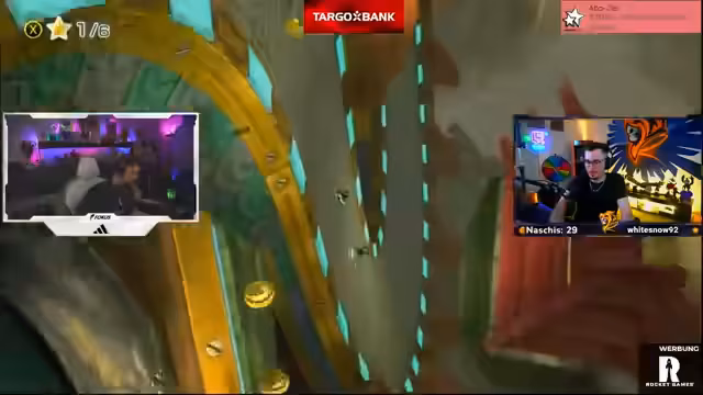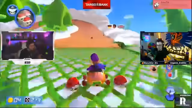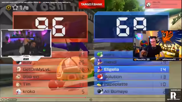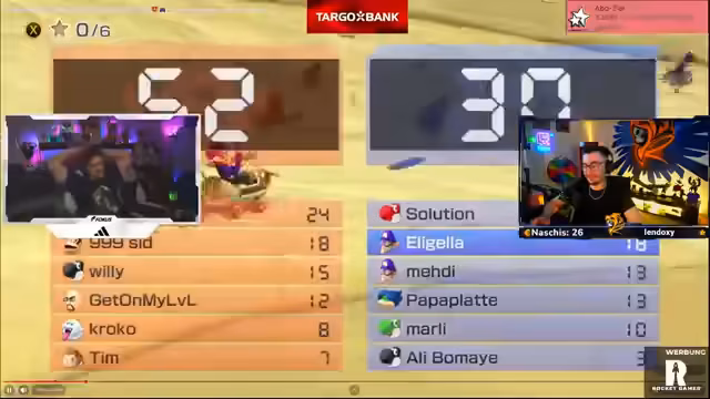 00:12:17Nach kurzer Vorbereitung beginnt eine umfassende Review der Highlights aus einem kürzlich abgehaltenen Mario Kart Cup. Caro hat Clips aus verschiedenen Perspektiven zusammengestellt, die nun im Detail angesehen werden. Die Review zeigt unterhaltsame Momente wie Danny, der mit einer Banane auf sich selbst feuert, und Eli, der durch desynchronisierte Server-Effekte vor Wänden zu schweben scheint. Die Clips dienen als reine Unterhaltung und verbessern die Stimmung im Stream. Es werden sowohl glückliche als auch katastrophale Fahrten der Teilnehmer gezeigt und kommentiert.