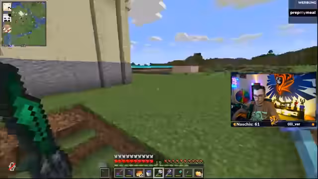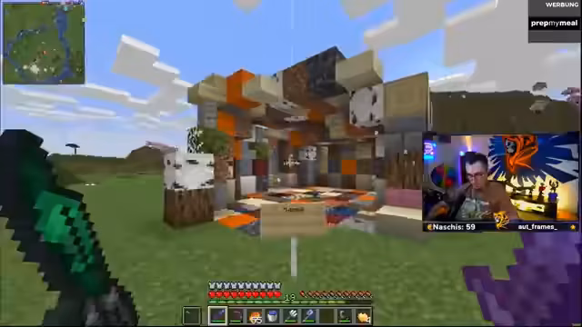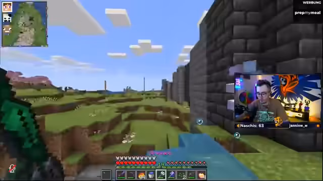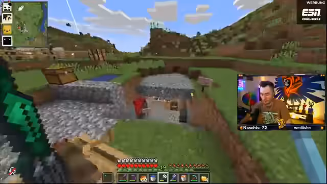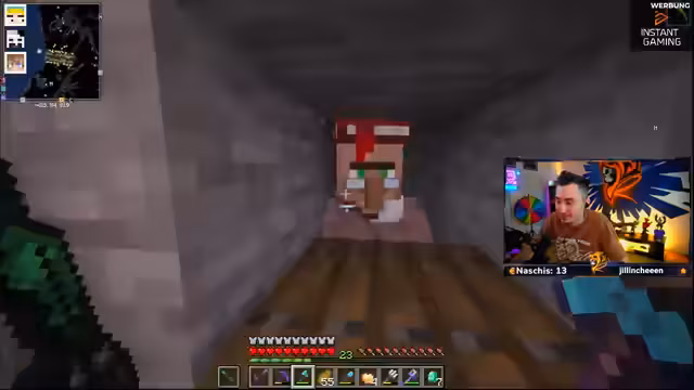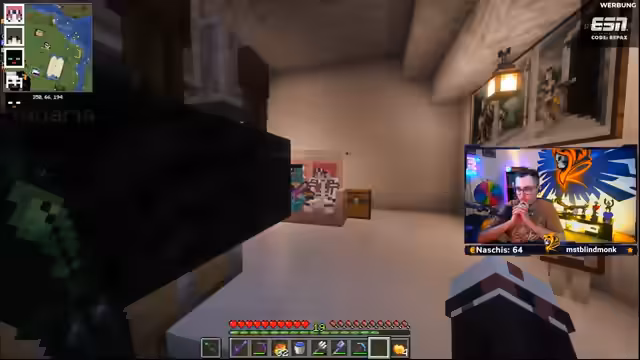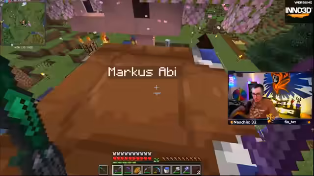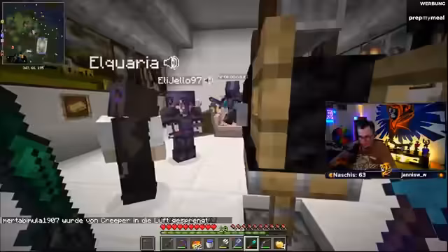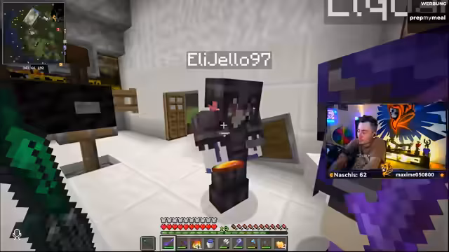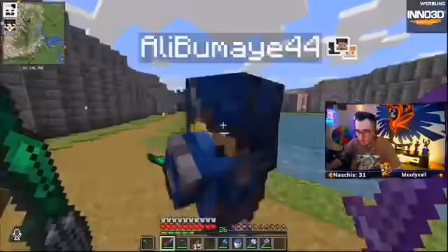 00:12:45Beim Bau der Arena trifft repaz auf Norex (Noriaks) und diskutiert über Gruppenzugehörigkeit („Alman-Gruppe“). Es kommt zu einem Streit, als Norex erwähnt, repaz gestern „auf Kopf nehmen“ zu wollen – später versöhnen sie sich. repaz erklärt Spielmechaniken wie Trident-Bewegung (Sprinten im Wasser) und Totem-Nutzung. Parallele Events: Ein Zuschauer (Maus) hilft bei der Arena, während repaz seine Rüstung enchantet und Diamanten farmt.
