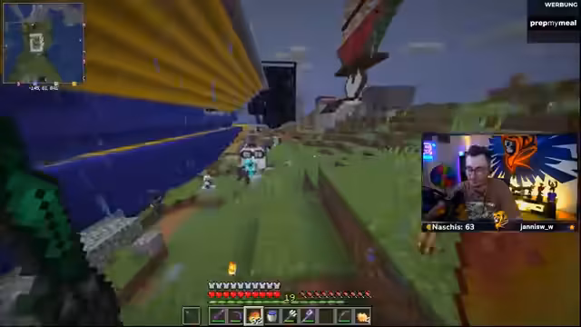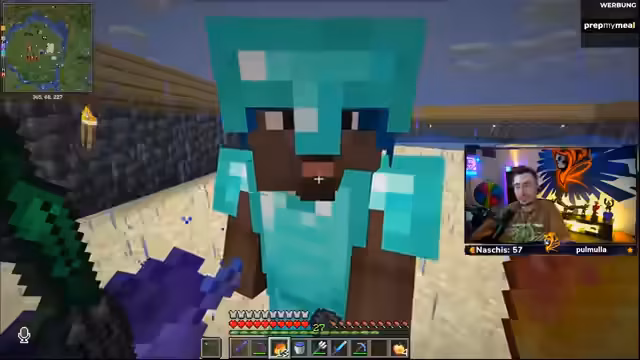 00:37:52Der Streamer unterhält sich intensiv mit der Community und anderen Teilnehmern wie Ali (Norex) und Noriaks. Er tauscht Ressourcen aus, gibt Ali einen verzauberten Trident und Totems und erklärt ihm dessen Funktionsweise. Dabei kommt es zu einem lustigen und leicht angespannten Moment, als Noriaks gesteht, den Streamer gestern auf den Kopf nehmen zu wollen, was im Rahmen von „Späßen unter Brüdern“ abgetan wird. Der Streamer betont seine PvP-Fähigkeiten und Freude an Kämpfen und demonstriert seine Fortbewegung mit einem Trident im Wasser.