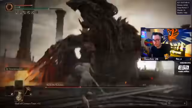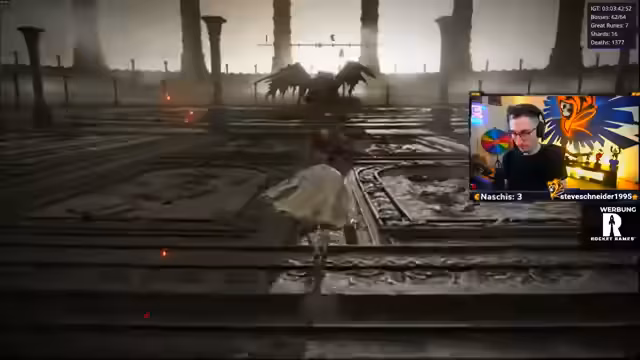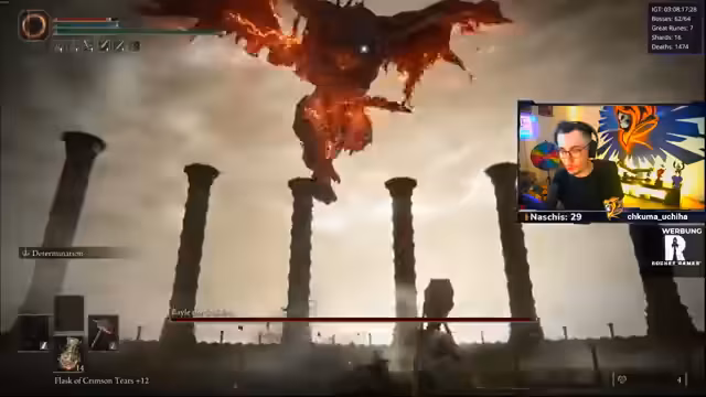 03:12:56Während des Kampfes bemerkt der Streamer plötzlich, dass seine Ausdauer auf null ist, obwohl er nach einem Finisher nur zwei Treffer landed hat. Dies führt zu unkontrolliertem Rennen und letztlich zum Tod. Er vermutet einen Bug in der Arena, da sich die Kamerasteuerung und die Position der Angriffe unvorhersehbar verhalten. Er ist der Meinung, dass die Attacken des Bosses normalerweise an seiner Position erscheinen, aber in der Arena völlig zufällig sind, was das Kämpfen zusätzlich erschwert.