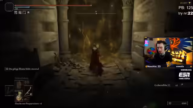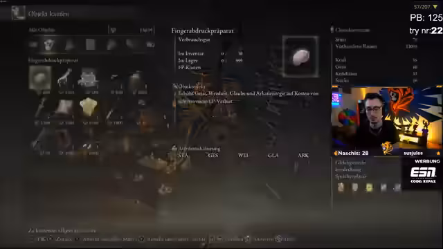 01:57:17Der Streamer ist aufgrund von Schlafmangel erschöpft und kämpft mit dem Gedanken, einen Boss-No-Hit zu versuchen. Nach einem anscheinend schwierigen Kampf gegen den Klangperlenjäger-Entertainer, als Sau nervig bezeichnet, wird der Fokus auf den bevorstehenden Kampf gegen den Volldesritter gelegt. Es wird die Möglichkeit erwogen, die aktuelle Waffe zu heiligen. Gleichzeitig wird ein Talisman namens Ritualschild als einer der besten für eine No-Death-Challenge erwähnt, der 30% weniger Schaden bei vollem Leben gewährleistet.