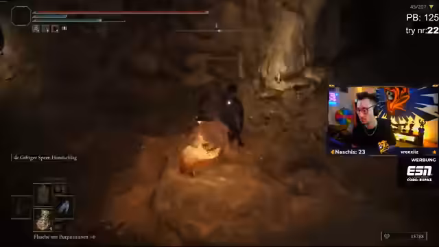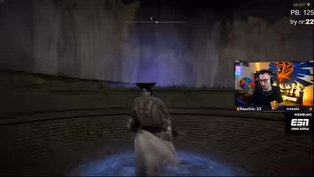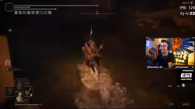 02:52:37Vor dem finalen Scheitern gelingt dem Streamer ein bemerkenswerter Sieg gegen den unsichtbaren Assassinen. Durch geschicktes Hinterher schleichen, Abhören der Schritte und einen perfekt getimten Backstab in die L2-Attacke wird der Boss besiegt. Dieser Moment wird als "fucking Geniestreich" gefeiert und bietet eine kurze Atempause in der ansonsten frustrierenden Situation. Es wird auch erwähnt, dass dies der erste Timeout im Stream war.