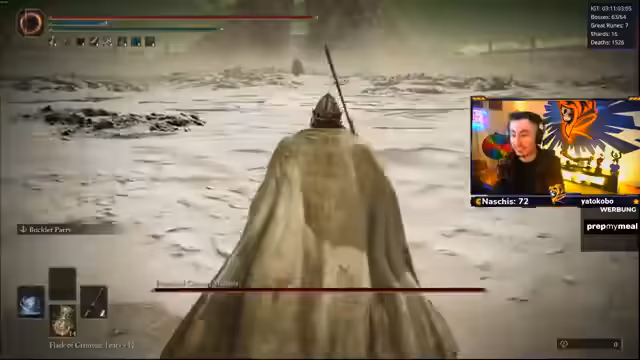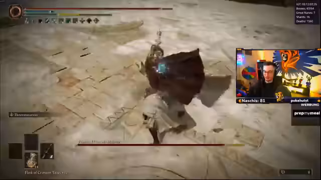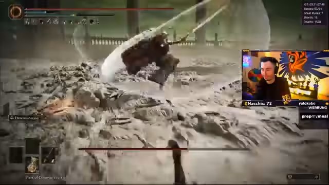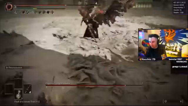 07:03:44Der Streamer kämpft gegen eine spezielle Version von Malenia, deren Angriffe extrem aggressiv und schwierig zu blocken sind. Er bemerkt, dass sie seine Angriffe parieren und sofort einen gefährlichen Konterangriff, den 'Döner', einleitet. Bei einem Versuch, sie selbst zu parieren, wird sein Angriff ebenfalls geblockt, was auf einen Bug hindeutet, bei dem Malienia ein Parry auslöst, obwohl sie eigentlich die am Boden liegende sein sollte. Er ist frustriert, da er ein Parry nutzen möchte, es aber als ineffektiv ansieht.