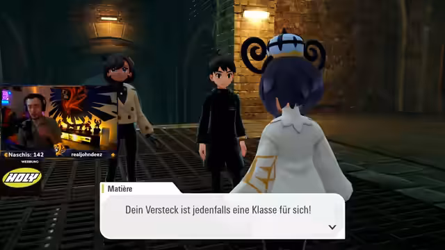 05:11:22In der Kanalisation begegnet der Streamer neuen Pokémon wie Walget und fängt weitere Pokémon, um Erfahrungspunkte zu sammeln. Er entdeckt eine versteckte Wand, die sich als Illusion entpuppt, und findet dahinter Scalabra, Gwyns Partner-Pokémon. Es stellt sich heraus, dass Gwyn sich freiwillig in der Kanalisation versteckt hat, um ihrem Bruder aus dem Weg zu gehen, der sie ständig zu Aufstiegskämpfen drängt. Sie hat sich mit Scalabra und Klavion versteckt, um ohne ihr Smartrotom nicht an weiteren Kämpfen teilnehmen zu können. Der Streamer muss gegen Gwyn kämpfen, um die Wahrheit zu erfahren. Nach dem Kampf erklärt Gwyn, dass sie sich vor den ständigen Kämpfen und Beschwerden über ihren Bruder schützen wollte. Sie fordert den Streamer auf, ihren Bruder im nächsten Aufstiegsmatch zu besiegen, um ihm eine Lektion zu erteilen. Der Streamer bereitet sich auf den Kampf vor, während er die Kanalisation weiter erkundet und über die Möglichkeit nachdenkt, dort Shiny-Pokémon zu jagen.