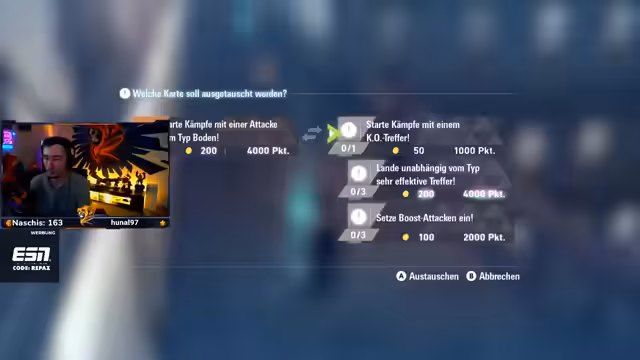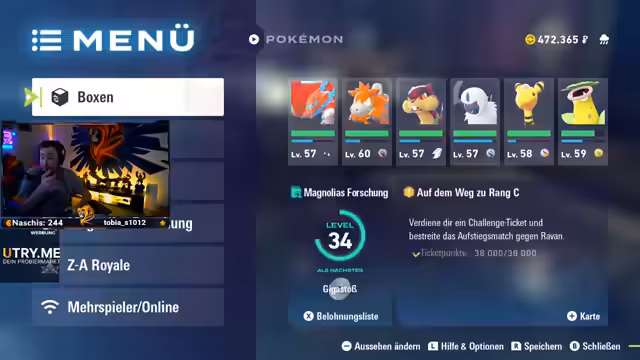 01:56:09Der Streamer bereitet sich auf den Rangaufstieg vor, um von Rang E zu Rang D aufzusteigen. Dafür muss er ein Aufstiegsmatch gegen Trainer Gavin bestreiten, der als Leiter eines Karate-Dojos bekannt ist und sich mit Kampf-Pokémon auskennt. Der Streamer stellt fest, dass er keine effektiven Pokémon gegen den Typ Kampf hat und überlegt, wie er diese Schwäche ausgleichen kann. Er muss Challenger-Tickets sammeln, um am Kampf teilnehmen zu können, was er durch das Sammeln von Royal-Punkten im InCenter erledigen will. Er reflektiert über die Ursache der Mega-Manie-Entwicklungen und die Rolle der Quasar Corporation.