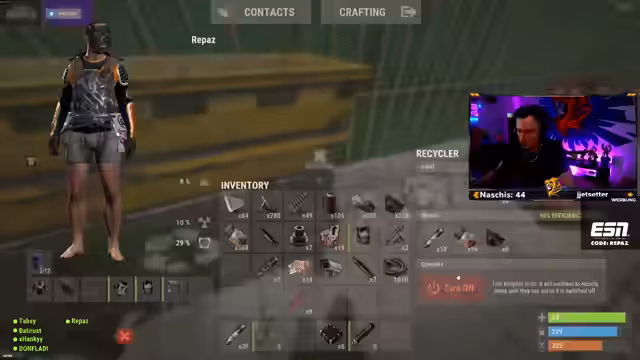 04:36:46Innerhalb des Teams wird die Verwaltung von Ressourcen und Inventar optimiert. Es werden Kisten gefüllt und sortiert, wobei der Fokus auf das Bereitstellen von Waffen wie AKs und Rockets liegt. Tech- und Metal-Blades werden als überflüssig identifiziert und zum Recyceln vorgesehen, um Platz zu schaffen. Der Recycler wird als zentraler Punkt für das Aufräumen und Umwandeln von Materialien genutzt, um die Ausrüstung für die bevorstehende PvP-Phase effizient vorzubereiten.