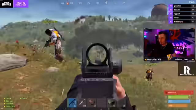 05:47:34Das Team ist in einen Kampf auf einem Berg verwickelt, bei dem Team-Mate Don Fladi als tot gemeldet wird. Der Streamer beobachtet Feinde aus verschiedenen Richtungen und bemerkt, dass sein Team-Mate Steven Hartz ebenfalls getötet wurde. Währenddessen wird der Streamer selbst angegriffen, kann aber entkommen und sucht Deckung, während ein weiterer Gegner auf dem Berg gesichtet wird. Er stellt fest, dass er keine Rüstung und nur eine Waffe besitzt.