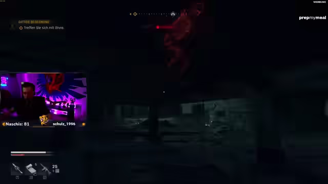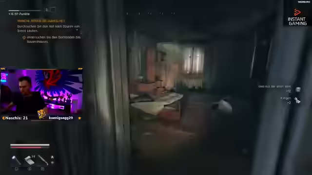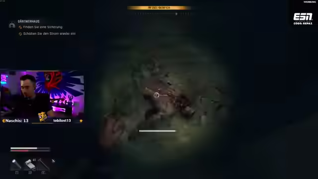 05:17:19Der Streamer trifft auf Sven, der ebenfalls ein Versuchskaninchen ist und aufgrund seiner Infektion eine telepathische Verbindung zum Streamer herstellen kann. Sven bittet den Streamer um Hilfe bei der Suche nach zwei seiner Leute, die verschwunden sind. Sie wurden zuletzt auf einer alten Basis westlich von hier gesehen, wo ein riesiger Mähdrescher steht. Der Streamer willigt ein, nach ihnen zu suchen. Während der Fahrt zur Farm wird der Streamer von Sven telepathisch kontaktiert. Er soll den Hof überprüfen und nach Spuren von Svens Leuten suchen. Der Streamer findet jedoch zunächst nichts. Der Streamer wird gefragt, ob sich das Game für 80 Euro lohnt. Er antwortet, dass er das nicht weiß, aber dass er das Game sehr geil findet.