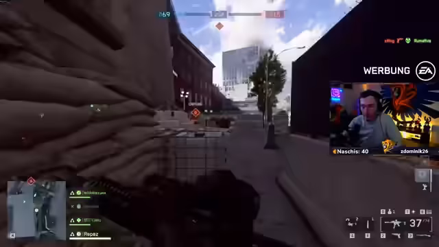 00:37:47Während des Spiels wird die Rolle der Mods, insbesondere die überdurchschnittliche Arbeit von "Karo" im Clip-Reporting, thematisiert. Der Streamer äußert sich unzufrieden über den Zustand der Defense-Karten in Battlefield, die er als langweilig und ungünstig für Sniping empfindet. Es werden taktische Fragen diskutiert, wie der Umgang mit der Waffenwechsel-Taste oder der sinnvolle Einsatz von Granaten und C4 für die Sniper-Klasse. Ein im Chat geteilter Clip eines Shiny-Sigardes sorgt für Aufsehen.