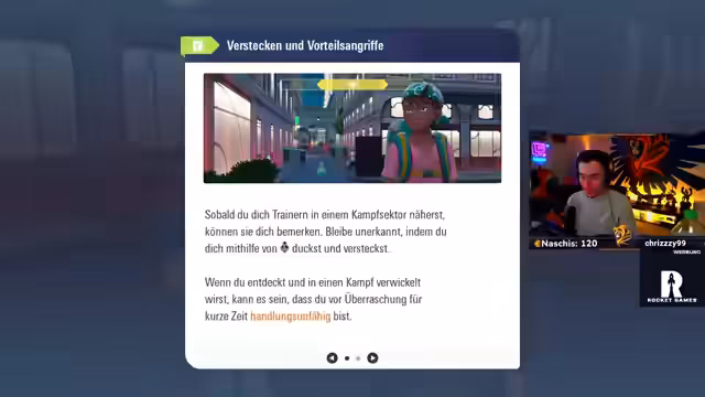 08:23:42Der Streamer beginnt mit dem Tutorial und den ersten Schritten in Illumina City. Er stellt fest, dass es sich um das erste Pokémon-Game handelt, das von Release an flüssig in 60 FPS läuft. Ein Hauptaugenmerk liegt auf dem neuartigen Kampfsystem, bei dem sich die Charaktere während des Kampfes frei bewegen und man zur Verteidigung ausweichen kann. Der erste Kampf gegen einen NPC namens Anouk wird als Versuch dieser neuen Mechanik gezeigt, der als 'interessant' und 'simpel, aber was Neues' bewertet wird, auch wenn die Kämpfe im Tutorial noch sehr grundlegend sind.