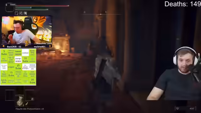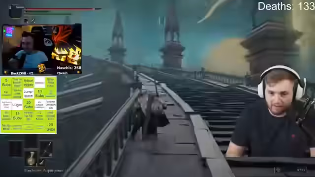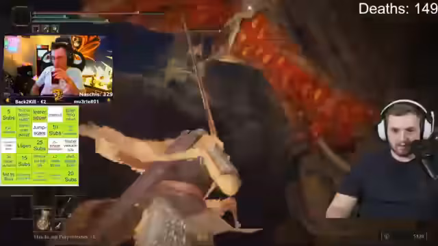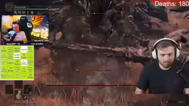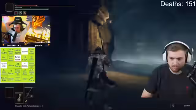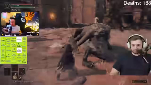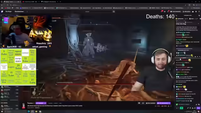 11:30:11Der Streamer kämpft gegen den Salamander, einen Boss, der durch eine große Distanz und Range-Attacks auffällt. Er beschreibt die Kämpfe als sehr unangenehm, da der Boss ständig 40 Meter Distanz hält. Ein Problem mit dem Steuerknüppel führt zu einem plötzlichen Absturz. Der Chat macht ihm Vorwürfe, jeden Gegner zu töten, anstatt nur vorbeizulaufen. Der Streamer gerät unter Druck, da der Weg zum Boss sehr lang ist und die geringe Heilungsmenge die Dinge erschwert. Trotzdem bleibt er motiviert und entschlossen, den Boss zu besiegen.