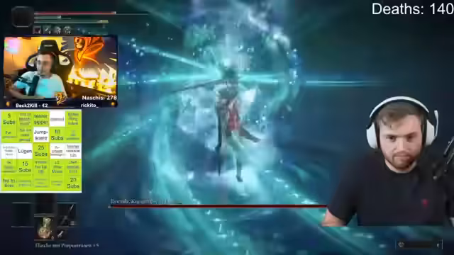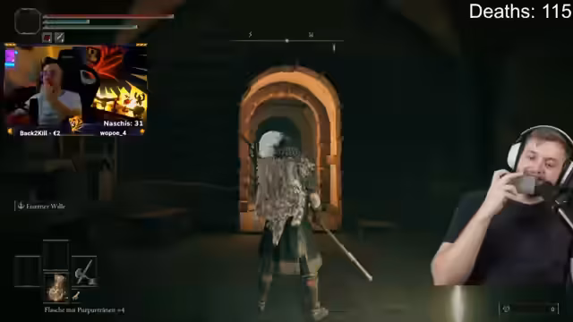 03:57:12Es wird viel über Bosskämpfe gesprochen, was die Nerven kostet. Der Streamer hat zwei Jahre lang einen Kollegen therapiert, um ihn für Elden Ring zu begeistern. Max kämpft gegen den Karianischen Ritter, den er jedoch nicht parrieren kann, was zu Frustration führt. Die Freude über den Lila-Drop einer Waffe schlägt in Verärgerung um, da Max die Items nicht aufhebt.