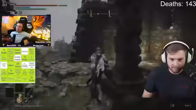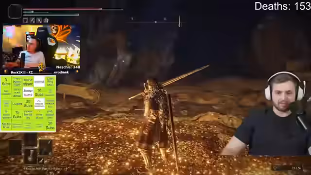00:26:58Der Fokus verschiebt sich auf die Beobachtung von Max' Elden Ring-Live-Spiel. Der Streamer kommentiert intensiv den Kampf gegen den ersten Fragment-Träger, Godric. Er analysiert dessen Angriffsmuster, insbesondere den 'Bodenhauer' und den 'Wirbel', und kritisiert, dass Max zu oft auf Distanz bleibt, anstatt aggressiv Nahkampf zu führen. Nach etwa 15 Stunden Spielzeit und 121 Toden gelingt Max der Sieg über den Boss. Dies löst im Chat große Begeisterung und eine Runde Bingo-Aktionen aus.