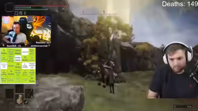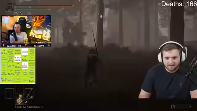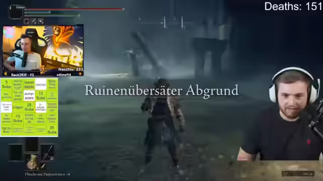 05:12:50Der Streamer setzt seine Erkundung fort und findet Fake-Türen in einem Dungeon. Er erinnert sich daran, die Katakomben kürzlich in einem Randomizer No-Death-Run gemacht zu haben. Er entdeckt eine Geister-Talilia und fragt sich, ob er daraus Schmiedesteine machen kann. Er findet den Bogen raus und freut sich, selbstständig den Weg zu finden. Er bemerkt, dass in jeder Cutter-Kombo 50 Minuten lang jede Tür geschlagen wird. Er entdeckt eine Marika-Statue und vermutet, dass der nächste Boss nicht weit entfernt ist. Er sucht seit 8 Stunden nach einem Schmiedestein Level 3. Er wird von einem Spoiler-Chat gewarnt und reagiert darauf. Er ist überrascht, wie schnell ein Boss da war und stirbt. Er fragt sich, wie viele Nebenbosse es gibt. Er hört die ganze Zeit eine Schnecke und bemerkt, dass er sich nicht heilen kann, solange er im Bossfight ist. Er analysiert das Moveset des Bosses und besiegt ihn schließlich. Er stellt fest, dass dies nicht der Hauptgegner ist und findet den eigentlichen Gegner. Er fragt den Chat, ob er das Ding auch angreifen kann, während er mit dem Boss kämpft. Er bemerkt, dass er nur noch drei Tränke hat und dass man das Leuchten sehen kann, aber er weiß nicht, dass man das attacken kann. Er besiegt den Boss und fragt sich, ob das als Tod durch Schnecke zählt. Er möchte keinen Main-Boss machen und lieber die Map erkunden. Er will seinen letzten Schmiedestein Level 3 finden, befürchtet aber, dass er dann immer höhere Schmiedesteine haben will. Er wird von einem Boss gegrabbt und verliert 50% seines Lebens. Er stirbt und verliert 7000 Runen. Er bemerkt, dass die Schnecke leuchtet und fragt sich, ob er sie angreifen kann. Er stellt fest, dass er sich in dem Fight nicht heilen kann. Er besiegt den Boss mit einem Zauber und erhält Asche des Schimmersteinzaubers. Er stellt fest, dass er nur Asche und Zauberscheiße bekommt und keine neue Waffe. Er reitet zu einem Ort, um die Karte aufzudecken, und erwähnt, dass er EG besuchen wird. Er will den Schmiedestein Level 3 finden, auch außerhalb einer Höhle. Er findet das Game sehr geil und hätte nicht gedacht, dass es so gut ist. Er findet ein Kartenfragment und deckt damit die ganze Lion auf. Er fragt sich, ob er den Baum mitnehmen soll, und entscheidet sich dafür. Er fragt sich, was er essen soll, und entscheidet sich für rote Nudeln. Er wird von einem Baumwächter überrascht und ist One-Shot. Er hat nur noch vier Tränke, rollt aber sauber. Er verwendet eine Kristallträne, um Mana zu regenerieren. Er findet den Bosskampf gut und bezeichnet die Nudeln als Side-Boss oder Elite-Gegner. Er will nach Kayle zum Avatar. Er tötet die Bäume und kriegt nichts. Er erkundet viel und findet so wenig. Er geht Richtung Norden zu den Fickhänden. Er fragt sich, wie man überhaupt hochkommt. Er macht keine Upgrades, sondern sammelt immer 10.000 Runen und stirbt dann.