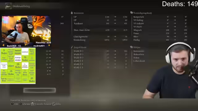 09:13:13Nach der Aktivierung der Großen Rune zeigt der Streamer die sofortige Wirkung im Spiel: Alle Attribute werden um fünf erhöht, was den Charakter massiv stärker macht. Der Lebensbalken wird deutlich größer und die Gesamtstärke des Charakters steigt enorm. Gleichzeitig warnt er eindringlich davor, diesen Buff durch einen Tod zu verlieren, da dies sehr frustrierend sei und mühsam wiedererlangt werden müsse.