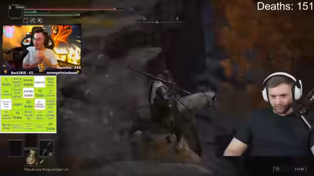 03:42:44Der Streamer steht vor verschiedenen Herausforderungen im Spiel, darunter der Kampf gegen clevere Gegner, die seine Angriffe unterbrechen. Er besiegt einen starken Gegner und betont, wie wichtig das war. Er erkundet die Umgebung und findet eine geile Rüstung. Er gerät in eine Situation, in der er von unendlich vielen Zombies umzingelt ist und versucht, zu entkommen. Er ist kurz davor, alles zu verlieren, kann sich aber retten. Er findet einen Dunkelspielstein 3 und einen überkrassen Gegner. Er besiegt einen Gegner und bedankt sich bei seinen Unterstützern. Er spielt Jump and Tackle und plündert Leichen. Er findet einen Schmiedelstein 3 und fragt sich, ob er auf das Ding drauf kann, was er nach oben fährt. Er verpasst leider die kardianische Rüstung. Er gibt Technik-Support im Chat und freut sich über einen gelungenen Run. Er ist am Limit und froh, eine Gnade erreicht zu haben. Er lobt das Spiel und seine Zuschauer. Er stirbt im Bossfight und lobt Elden Ring. Er findet den Linksklick mächtig und lobt seine cleaner Dodges.