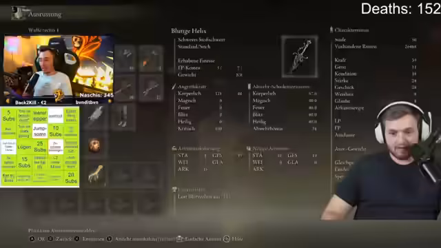 12:38:28Der Streamer äußert den Wunsch, seinen Charakter weiter zu stärken und spricht über verschiedene Möglichkeiten, dies zu erreichen, wie z.B. das Verbessern von Waffen, Rüstungen und Talismanen. Er plant, den Schwarzschmied aufzusuchen, um seine Ausrüstung zu verbessern. Es wird diskutiert, ob das Problem eher an der Waffe oder an fehlender Ausdauer liegt. Der Streamer wird von einem Zuschauer verspottet, was zu einer humorvollen Reaktion führt. Anschließend konzentriert er sich wieder auf die Verbesserung seines Charakters und sucht nach Möglichkeiten, seine Werte zu optimieren. Der Streamer trifft auf eine ausgewachsene Sternenfallbestie, die sich als besonders stark erweist. Er diskutiert mit dem Chat über Softcaps und Hardcaps beim Leveln von Attributen und erklärt, dass es auch nach dem Softcap noch Sinn macht, weiter zu leveln, wenn auch weniger effektiv. Er versucht, an der Bestie vorbeizukommen, um weiterzukommen, und freut sich, dass er seine Runen vorher ausgegeben hat.