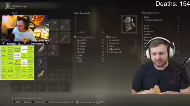 12:16:03Zwischen den Kämpfen wird das aktuelle Build des Charakters genauer unter die Lupe genommen. Es stellt sich heraus, dass ein genutzter Talisman kaum positive Effekte bringt und das Platzieren des冤罪 Sceals nicht sinnvoll ist, da es die Resistenzen verschlechtert. Der Streamer rät dazu, die Ausrüstung zu optimieren und wager darauf, dass der Boss auch ohne perfektes Equipment machbar ist, allerdings viel Geduld erfordert.
