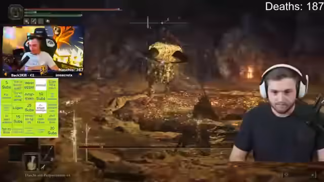 00:37:35Repaz freut sich über die erhaltenen Subs und dass Max gerade gebrauchen ist. Er bedankt sich für die 20 gifted Subs und die 117 Nachschießtore. Er startet das Bingo neu und entfernt alle Felder. Er mag Gorex' Mucke. Er kommt nicht an den Boss ran. Er labert viel Scheiße. Er findet es nicht heraus, wie man diese Attacke dodgt und will jetzt googeln. Er überlegt, welche Felder er für das weichliche Bingo nehmen soll. Er stirbt und findet, dass es krass aussieht. Er fragt, ob Max das immer sagt, wenn er jemanden tötet. Er hat die Hände vom Controller genommen, da er den angebrannten Boden nicht dodgen kann. Er soll weitermachen. Er soll sprinten. Er soll das Tutorial anschauen. Er soll eine andere Waffe nehmen. Er geht sofort wieder in den Bossraum. Er findet, dass es ein leichter Boss ist. Er hat ein neues Schwert, mit dem er spielen will, aber es ist noch nicht hochgelevelt.