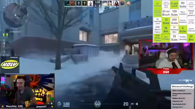 03:53:21Bei einem Counter-Strike-Match treten technische Probleme auf. Ein Spieler PC explodiert und muss das Spiel verlassen. Die verbleibenden Spieler versuchen, das Spiel zu fortzusetzen, aber sie haben Schwierigkeiten, die richtige Lobby zu organisieren und die richtigen Waffen auszurüsten. Es kommt zu Verwirrung über die Map und die Spielmodi.