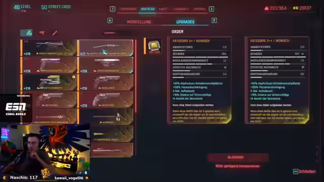 06:05:48Nachdem der Chimera-Kern erhalten wurde, hat der Streamer die Möglichkeit, sich zwischen vier verschiedenen Mods zu entscheiden. Er erhält Informationen über die Funktionsweise der Mods, darunter eine Mod, die bei Tech-Waffen das Laden auf 200% Kapazität ermöglicht und eine Mod, die Quick-Hack-Effekte automatisch anwendet. Allerdings stellt der Streamer fest, dass er seine Waffen noch nicht für Mods vorbereitet hat, da diese keine Mod-Slots haben.